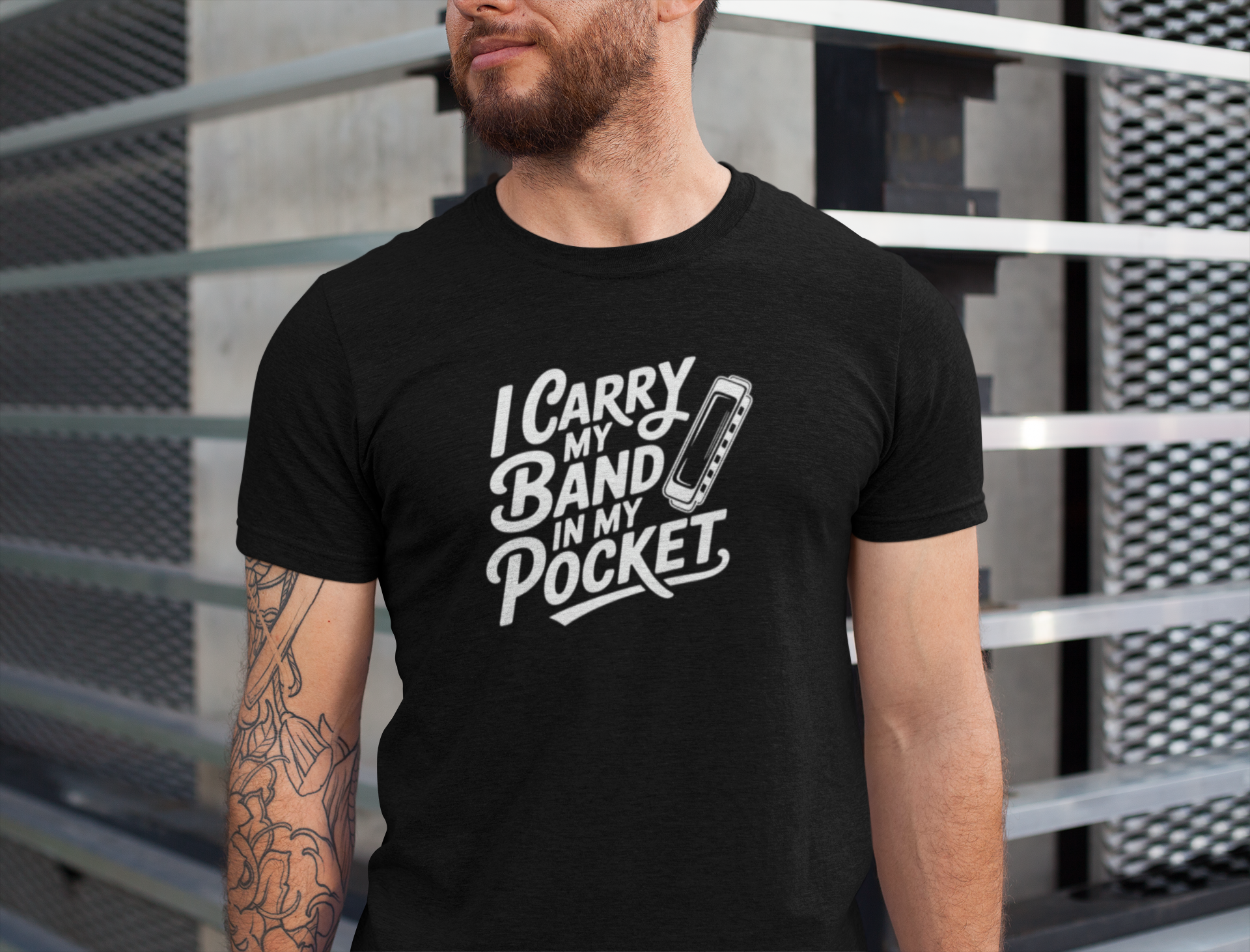Camiseta «I carry my band in my pocket» edición limitada. 100% algodón, color negro, estampado premium DTF.